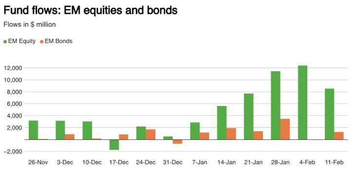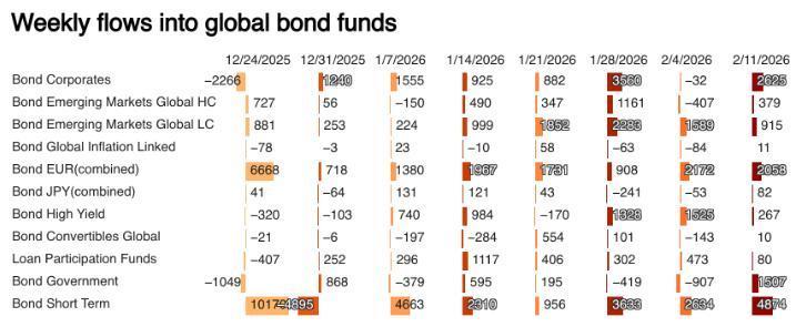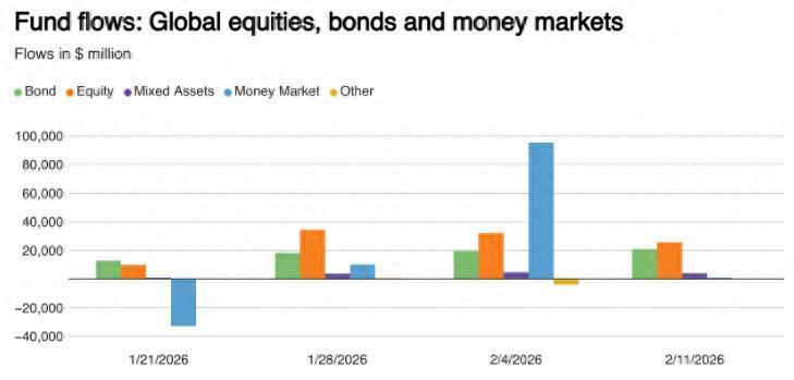 智通财经APP获悉,章程2月11日当周,欧洲和亚洲股票基金资金强盛流入,投资者因担忧估值过高和东谈主工智能相干支拨不断增长而减执好意思国大型股。LSEG Lipper数据清楚,人人股票基金邻接第五周净流入,资金总数达255.4亿好意思元,其中欧洲基金净流入175.3亿好意思元,创下至少自2022年以来单周最高记录;亚洲基金净流入约62.8亿好意思元。与此同期,好意思国股票基金当周净流出14.2亿好意思元,这是三周以来的初度净流出。